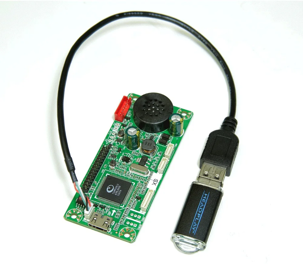 Find any female USB connector and strip the 4 wires. Solder the USB wires to the Headplay driver board by following the pinout and picture below.